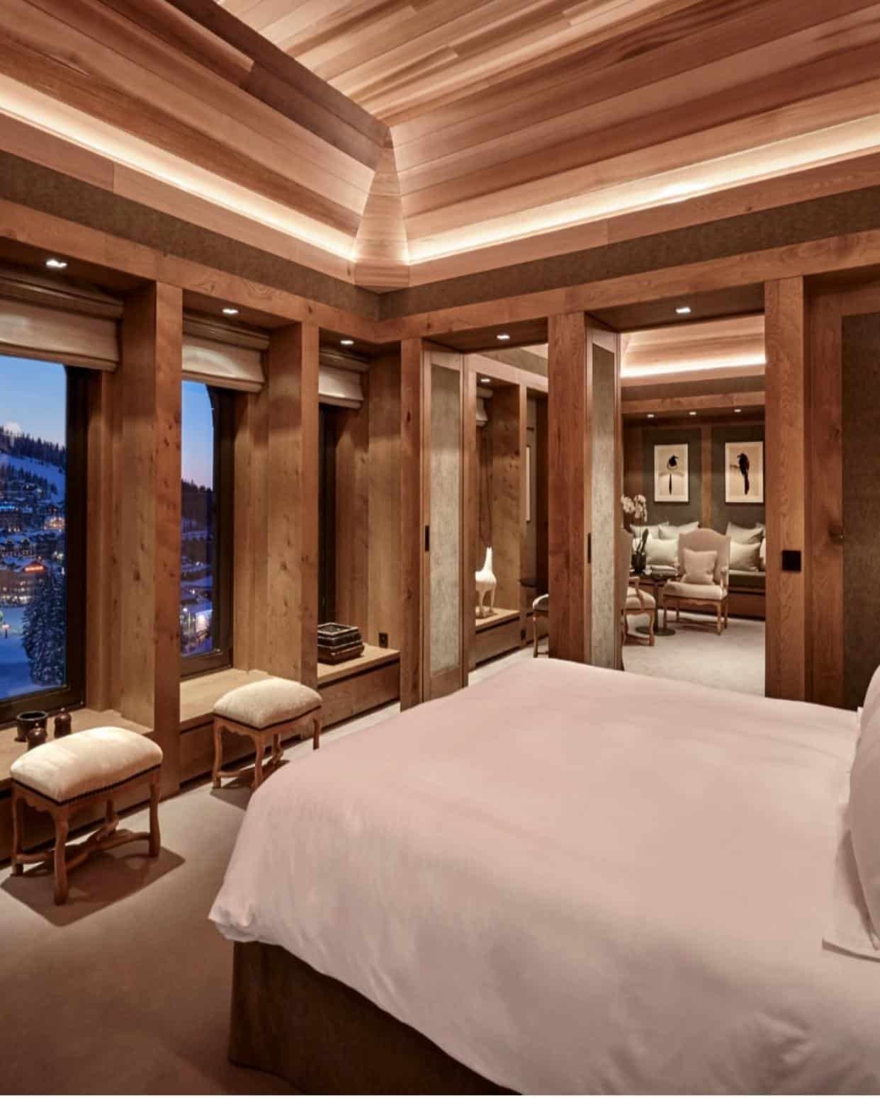 Each room and suite, adorned with pale wood and soft stone, evokes a sense of complete serenity. Every space opens onto snow-covered peaks, celebrating precision, balance, and the quiet beauty of nature.
